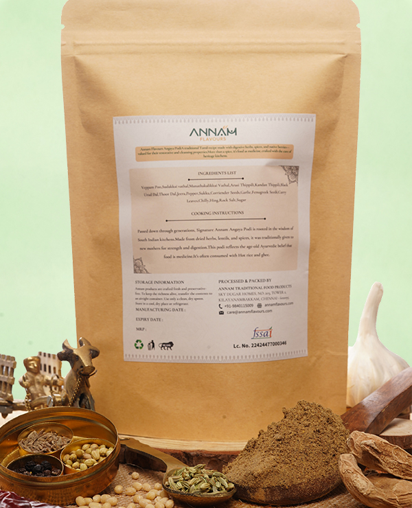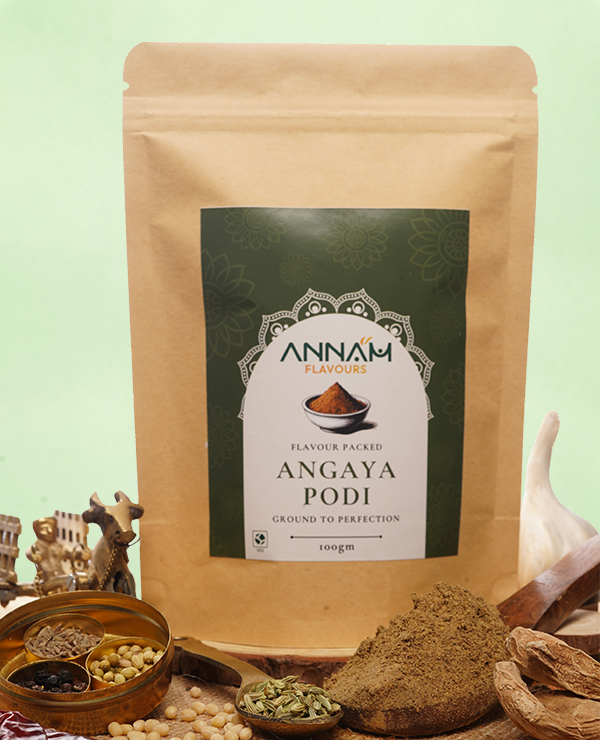 Annam Angaya Podi is a traditional Tamil herbal blend made with carefully selected digestive herbs, lentils, spices, and native berries. Rooted in heritage kitchens and Ayurvedic wisdom, this unique podi is valued for its restorative and cleansing qualities—bringing together flavour and nourishment in every spoonful.