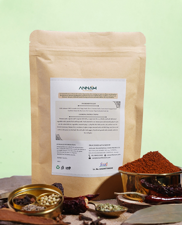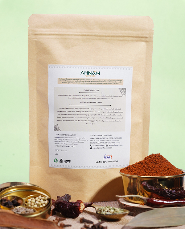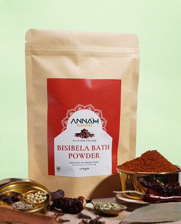 Annam Bisibela Bath Powder is a flavourful and aromatic blend crafted to recreate the authentic taste of traditional Karnataka-style Bisibela bath. Made with a balanced mix of spices and lentils, this blend delivers a rich, mildly spicy, and wholesome flavour in every spoonful.