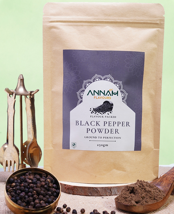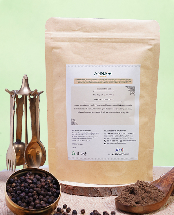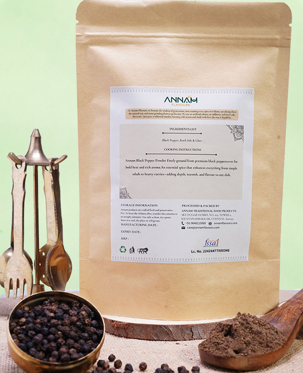 Annam Black Pepper Powder is finely ground from premium black peppercorns to deliver bold heat and rich aroma. Carefully processed to retain its natural pungency and flavour, this essential spice adds warmth and depth to everyday cooking.