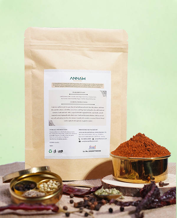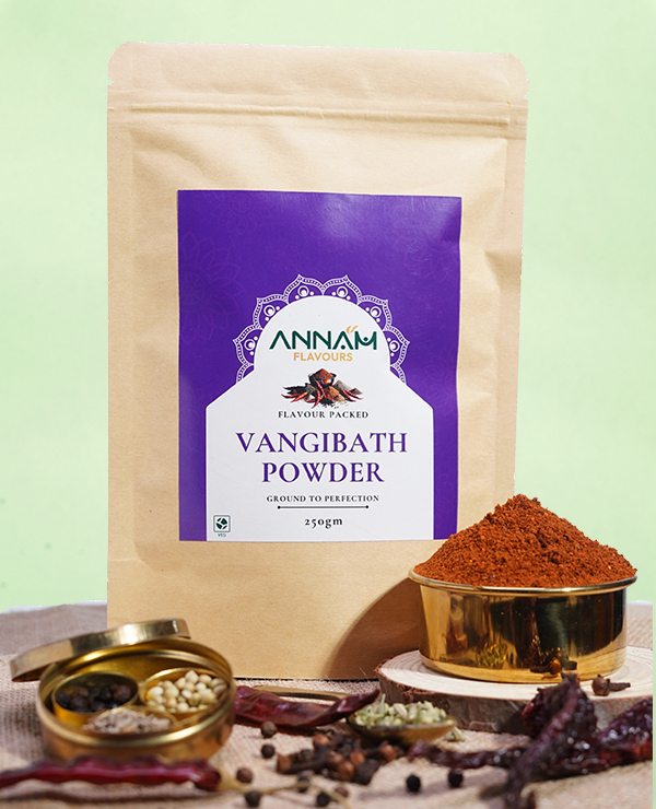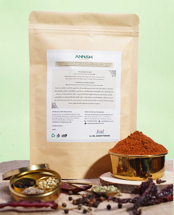 Our Vangibath Powder is made with carefully selected spices that are slow-roasted to unlock their full flavour and aroma. Each ingredient is sun-dried and stone-ground the traditional way, ensuring a deep, earthy taste that transforms simple rice into a wholesome, flavourful meal.