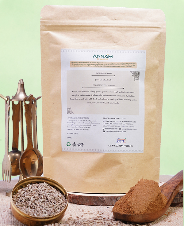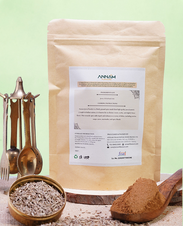 Annam Jeera Powder is made from high-quality jeera (cumin) that is carefully processed to retain its natural aroma and flavour. Finely ground for convenience and consistency, this everyday essential brings a warm, earthy depth to a wide range of dishes.