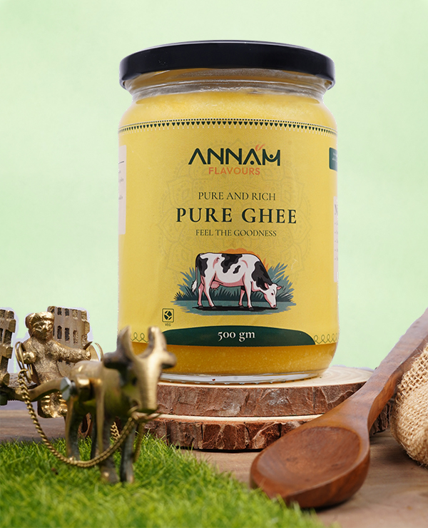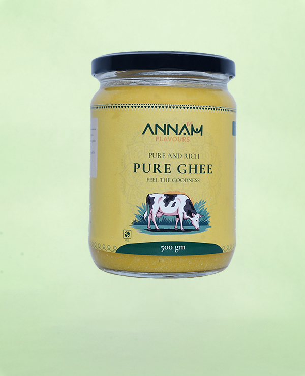 Annam Pure Ghee is traditionally prepared by slow-simmering fresh cream to achieve a rich, golden, and deeply aromatic texture. Made without shortcuts or additives, this ghee delivers authentic taste, purity, and the comforting flavour of heritage kitchens.