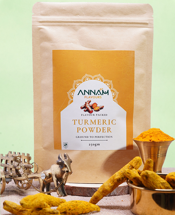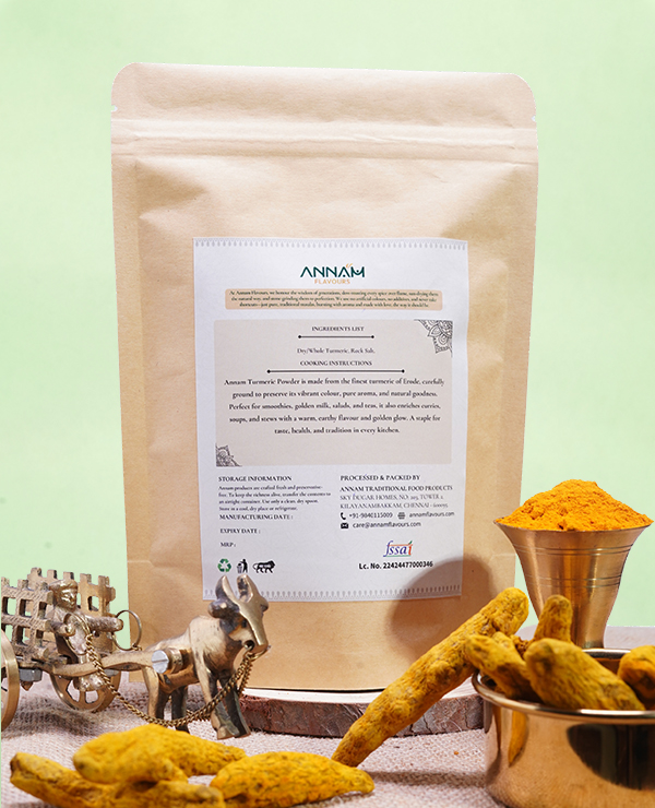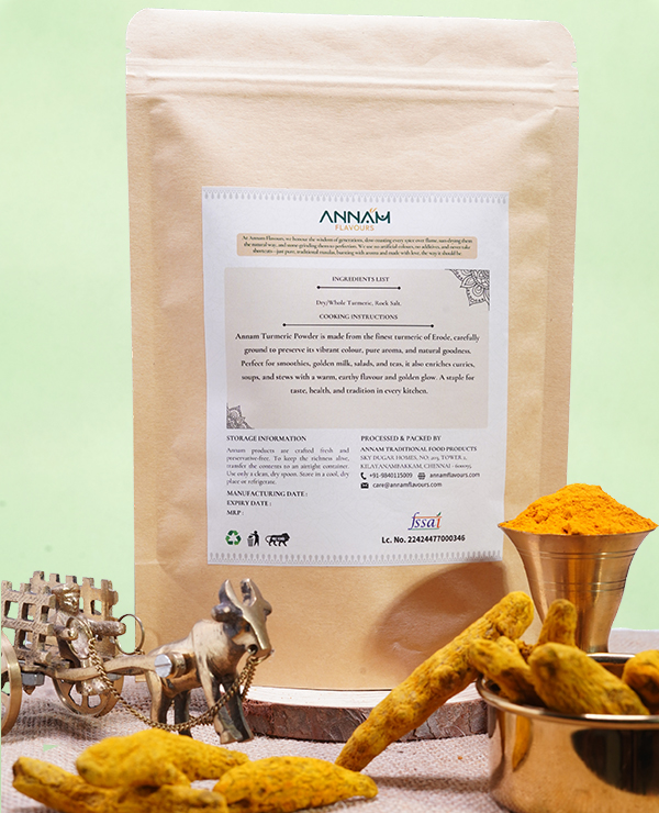 Annam Turmeric Powder is made from the finest turmeric of Erode, carefully ground to preserve its vibrant colour, pure aroma, and natural goodness. Perfect for smoothies, golden milk, salads, and teas, it also enriches curries, soups, and stews with a warm, earthy flavour and golden glow. A staple for taste, health, and tradition in every kitchen.